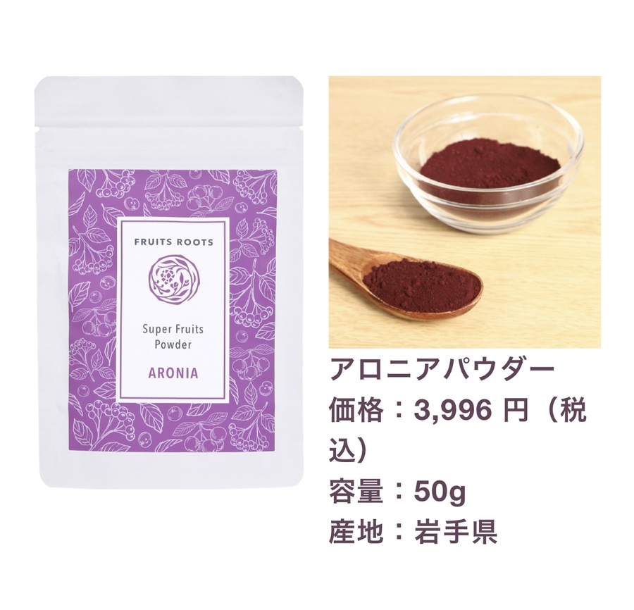| | スーパーフルーツパウダー (アロニア) アロニアは目に良いと言われる「アントシアニン」を豊富に含むことで知られています。また、体内では作ることが出来ないα-カロテン、β-カロテン、クリプトキサンチンなどのカロテノイドも含有しています。
